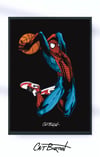This poster features Spider-Man wearing the Jordan 1 origins from into the spiderverse movie playing some b ball.